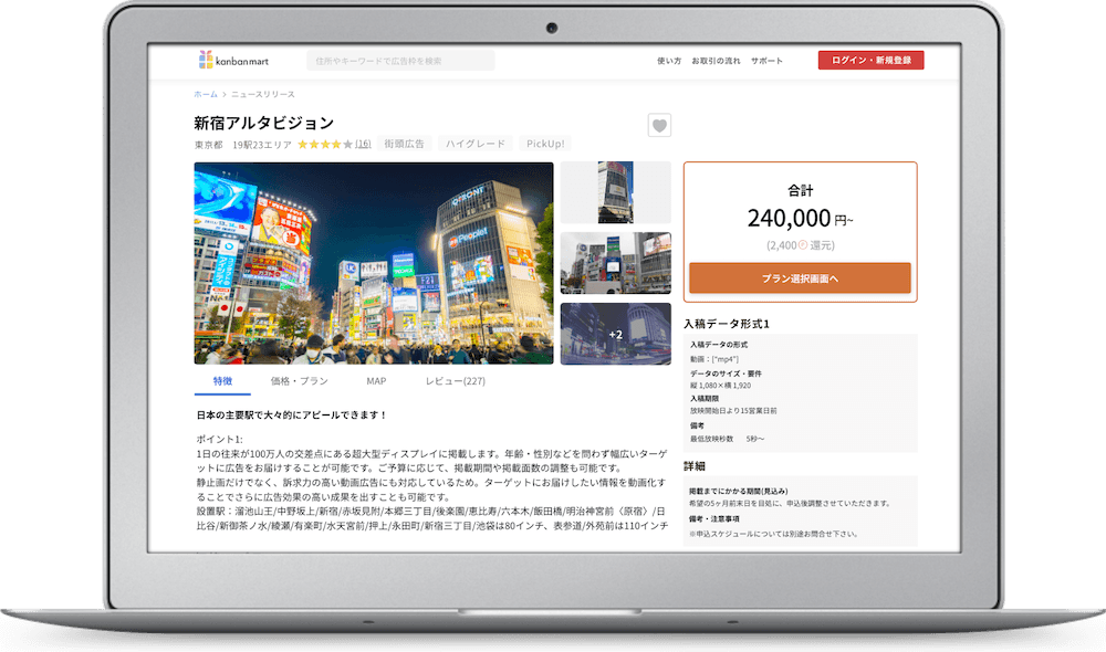 カンバンモールはネットショップのような感覚で自由に広告枠を出品することができるマーケットプレイスです。お客様同士のやり取りや売上の管理はカンバンクラウド内で一元管理が可能です。出品する広告枠の情報入力や、お客様とのやりとりをカンバンクラウドが代行するプランもご用意しておりますので、人員が少ないオーナー様でも安心してご利用いただけます。