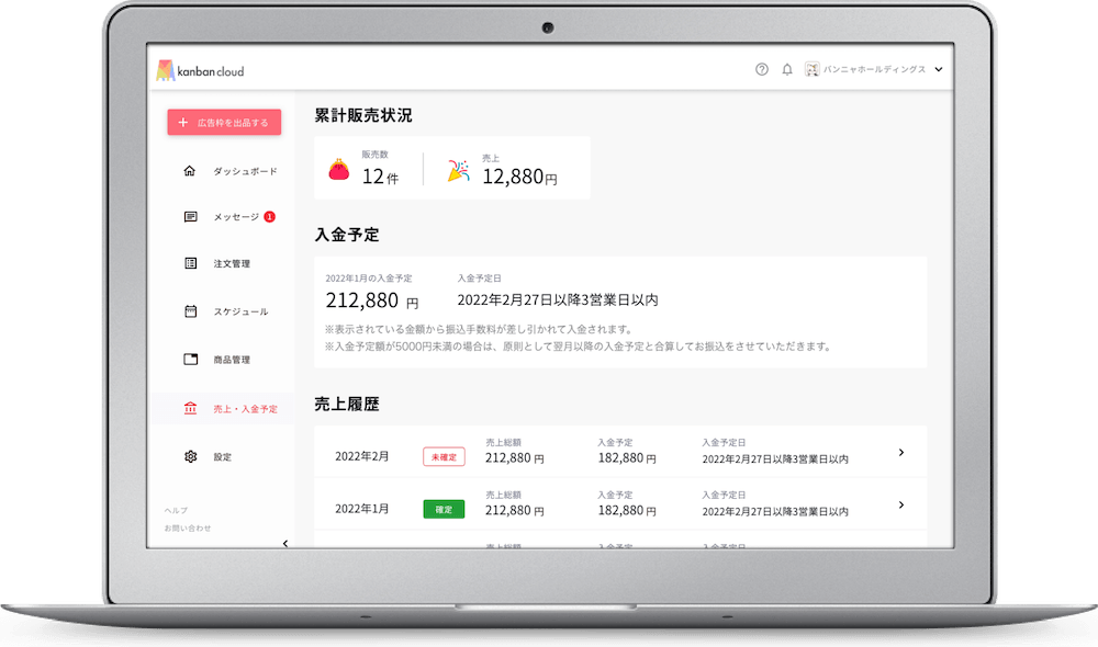 - カンバンクラウドのプラットフォームを通じて生み出された売上は、カンバンクラウド上で一括管理され、毎月一定の間隔でお客様銀行口座へお振込します。