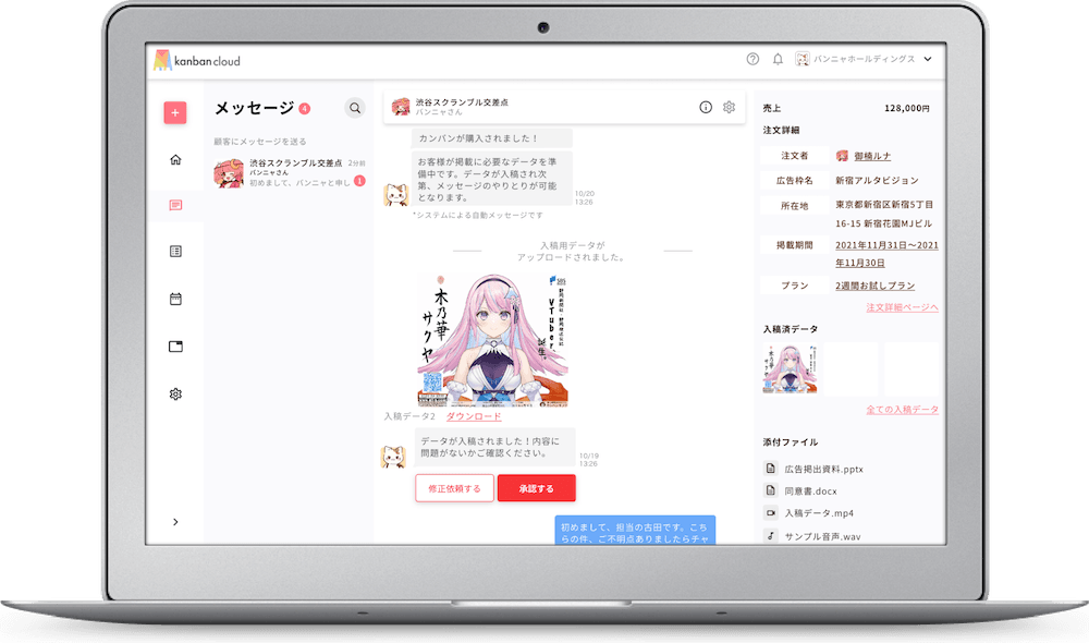 - 広告主へのデータ入稿依頼といった掲載までのやりとりは、メッセージ機能が自動サポート!データ承認機能や、追加料金の徴収、スケジュール調整も可能です。