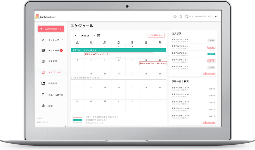 - カンバンクラウドでは、独自のマーケットプレイスに広告枠を出品できます。カード決済等にも対応しており、出品してすぐにお客様へ広告枠を販売できます。